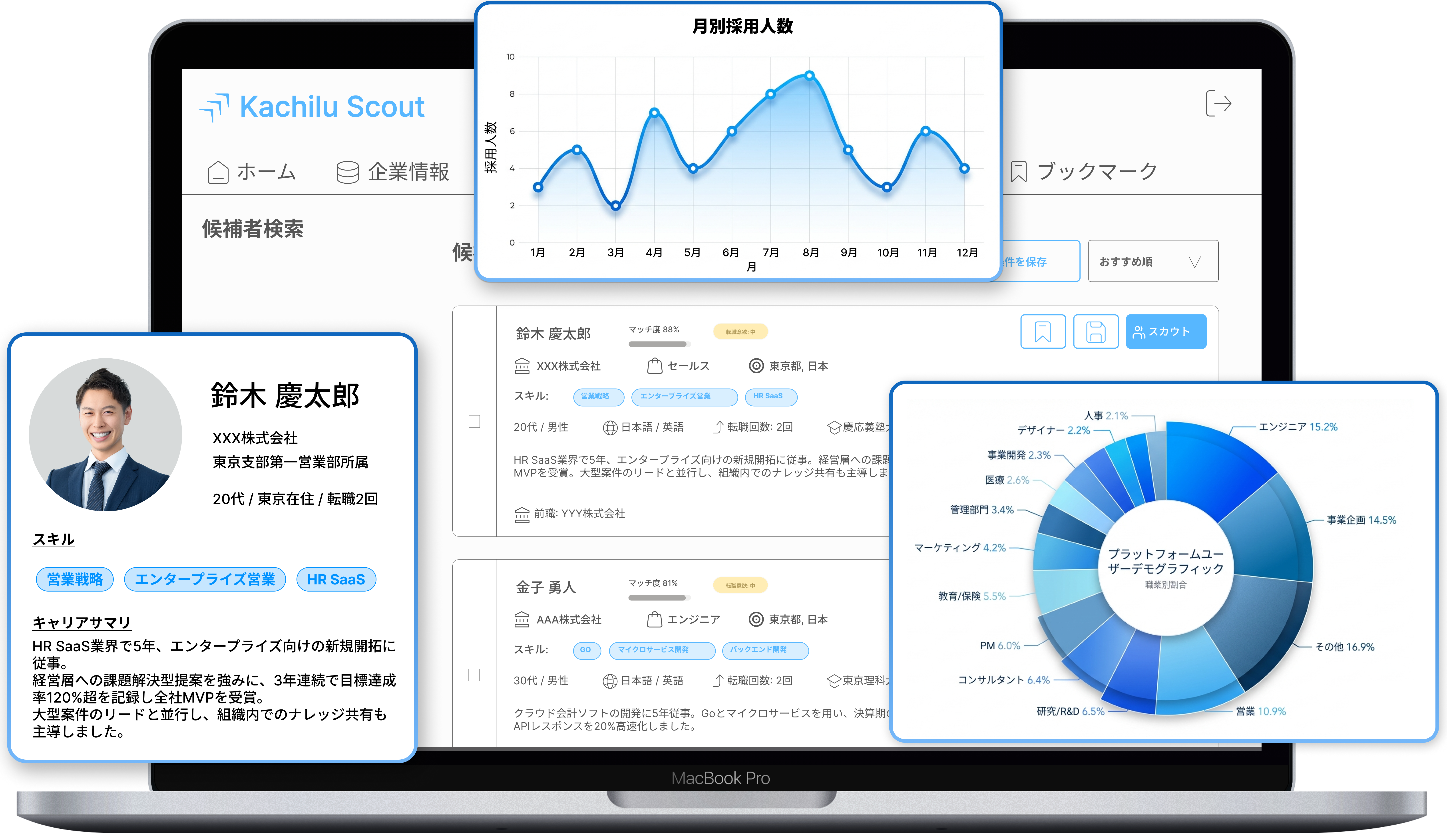 Web上のデータやSNSのオープンデータを集約して構築した、約200万人の優秀な転職潜在層にアプローチ。 従来の転職プラットフォームとは異なり、現職で十分評価され転職市場に現れていない即戦力の"優秀な転職潜在層"との接点を作ります。